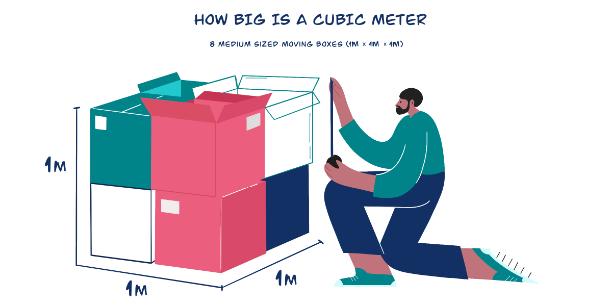 About eight medium sized moving boxes (typically measuring 50cm x 50cm x 50cm in Singapore) can fit into 1 cubic metre.